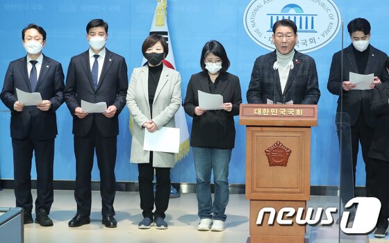 | 용산 이태원 참사 진상규명과 재발 방지를 위한 국회 국정조사 특별위원회 김교흥 더불어민주당 간사 등 야당 위원들이 13일 서울 여의도 국회 소통관에서 특수본 이태원 참사 수사 발표 관련 기자회견을 하고 있다. 2023.1.13/뉴스1 © News1 허경 기자 |